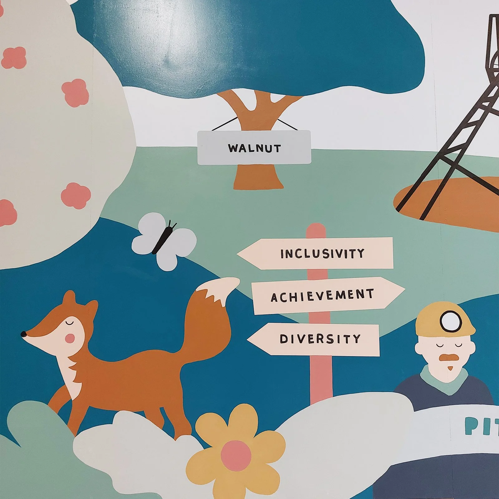 Murals can incorporate cultural, historical, or social themes, providing an opportunity for you to promote cultural awareness and inclusivity within your business. Murals can help to create a more inclusive and diverse work environment by celebrating the team members and the company’s journey. Company values could be reflected in the illustrations used and milestones can be celebrated within a timeline of notable events.