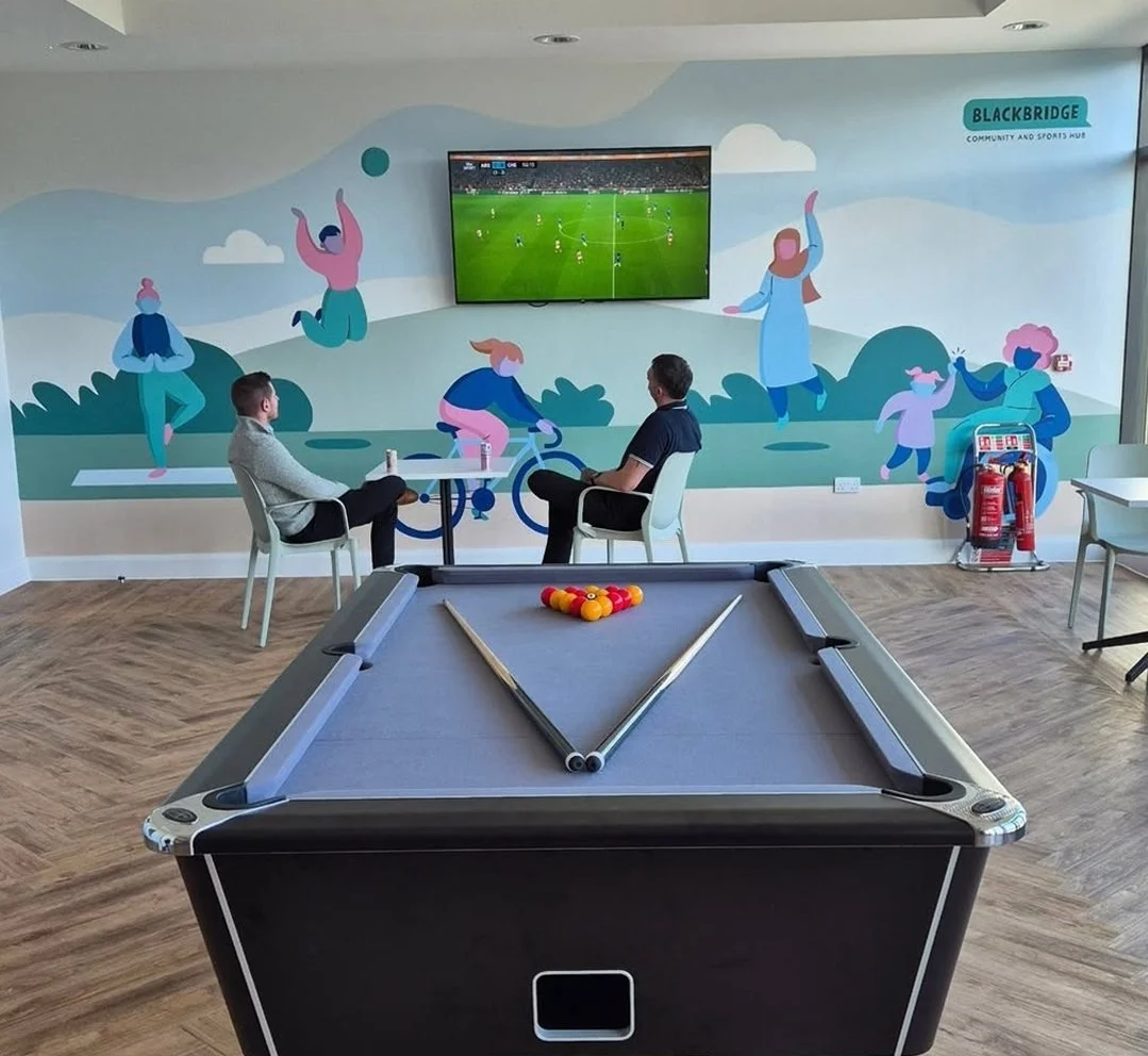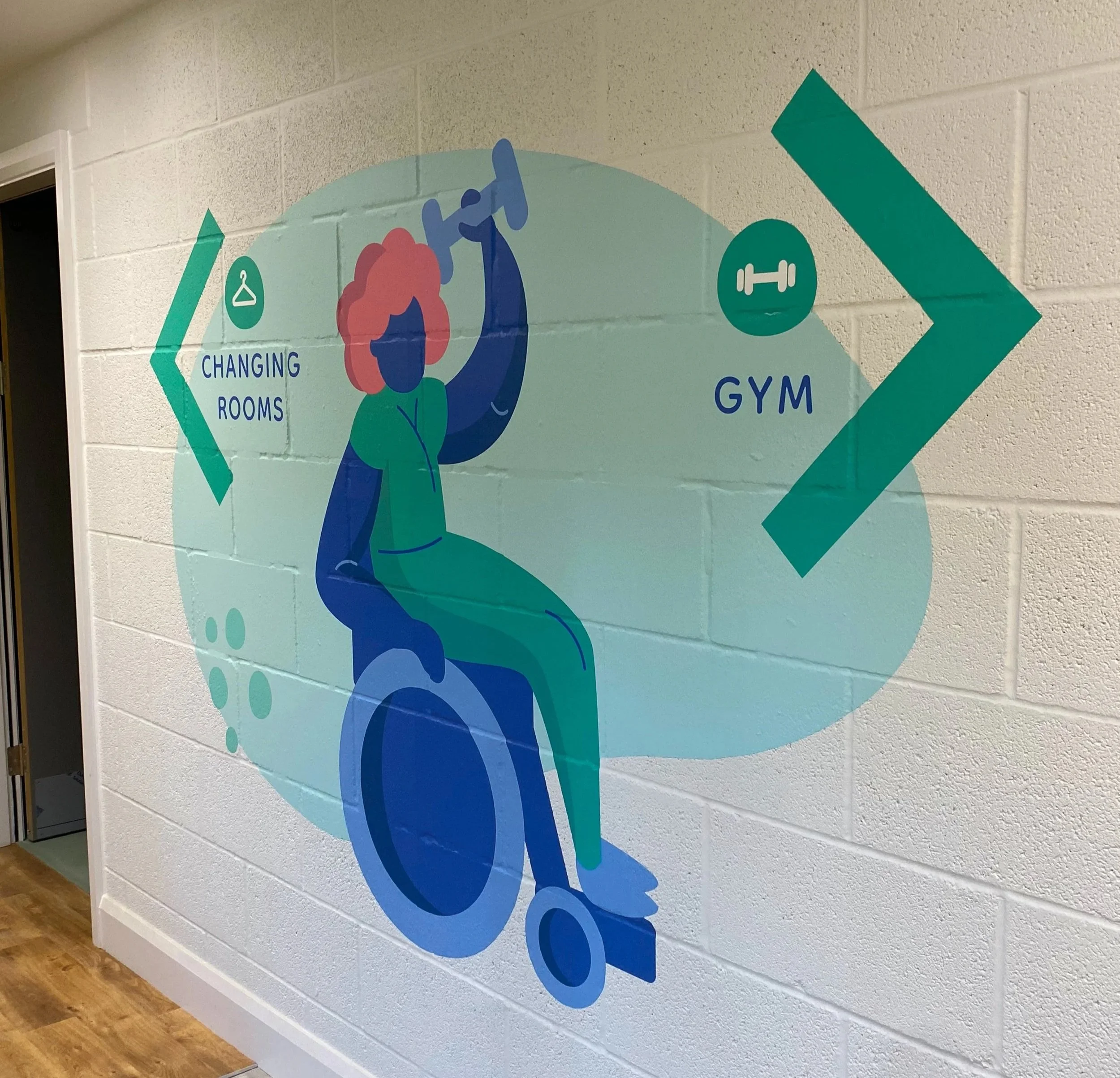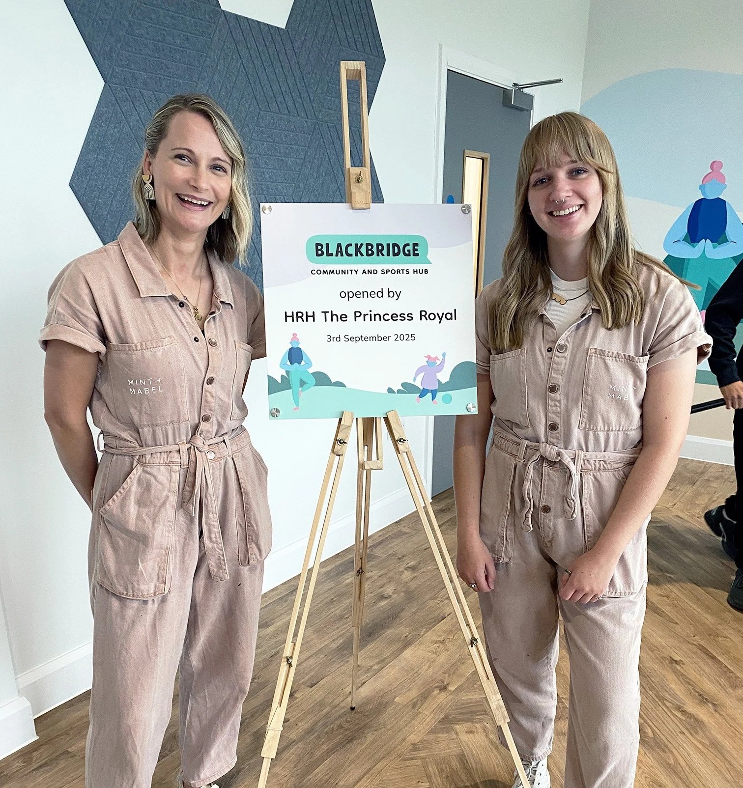 Murals can be a great way to get noticed - even by news and media. Mint + Mabel designed and painted murals for Blackbridge Community & Sports Hub, as well as designing the opening plaque, for the momentous occasion of a visit from HRH Princess Anne. Her Royal Highness unveiled the plaque and visited the new hub, recently adorned with murals and wayfinding graphics, and the event hit the news, getting more people talking about the new community space and spreading awareness of what they offer.