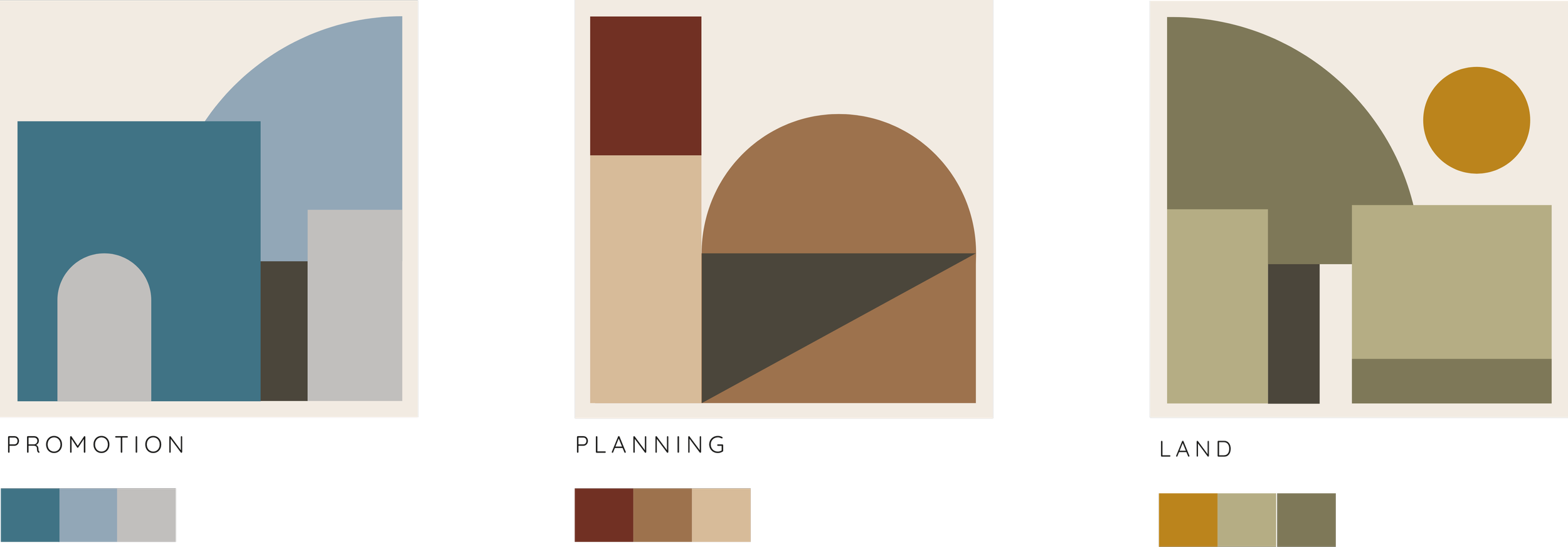 The ‘M’ icon is constructed from a series of lines that build together, creating a strong and versatile mark. We further developed the logo ideas and created a series of geometric shapes that link to each of the key services; planning, land and promotion. Each service has a specific colour way which helps clients visually distinguish between each service being promoted, ensuring the brand is both distinctive and instantly recognisable.